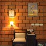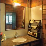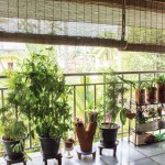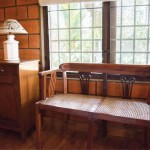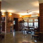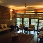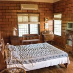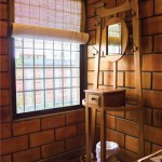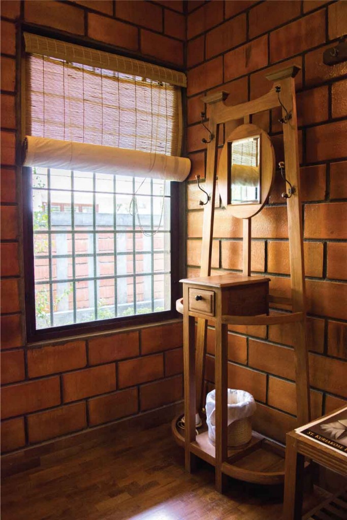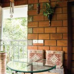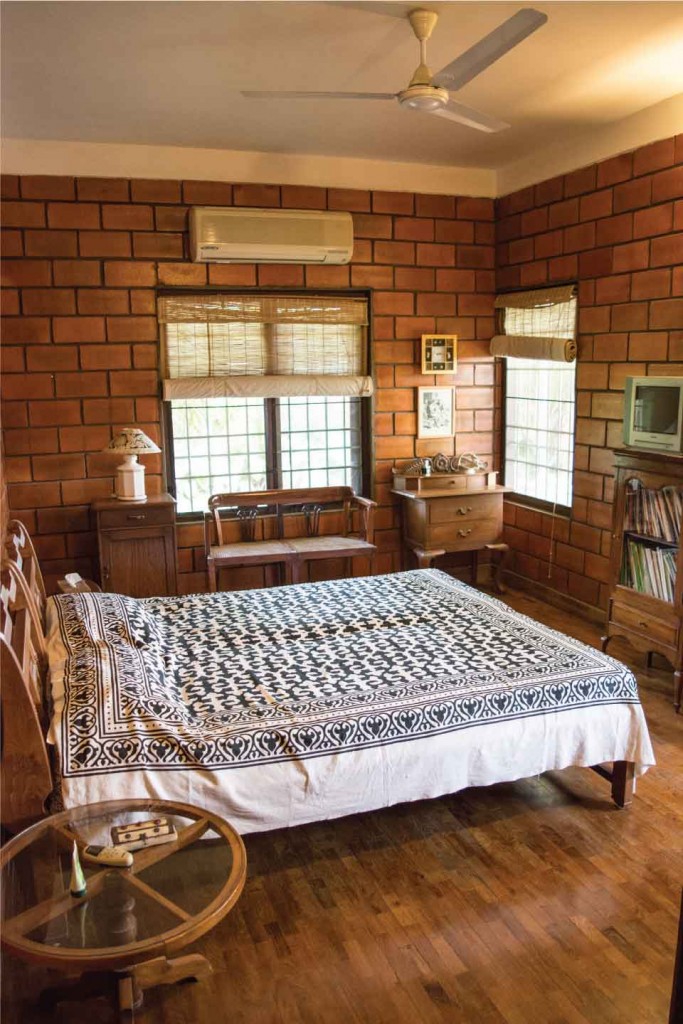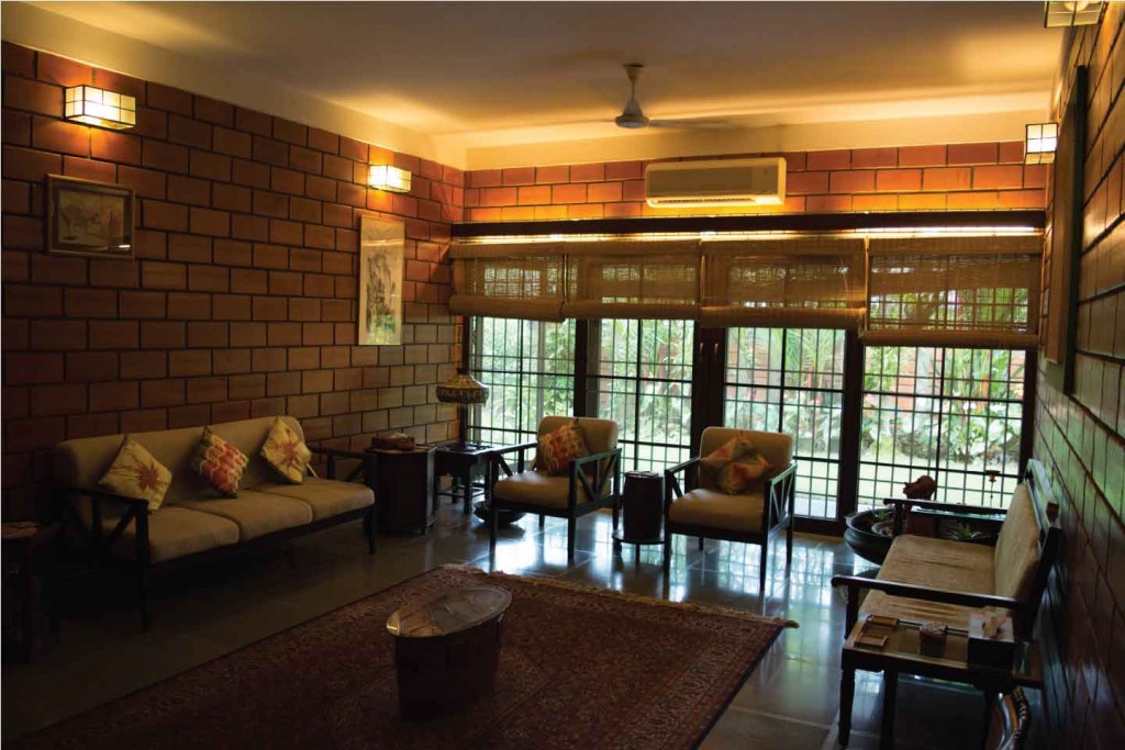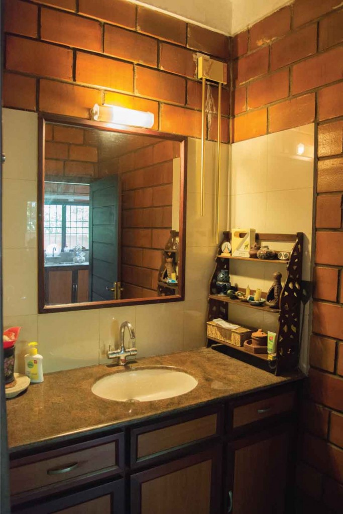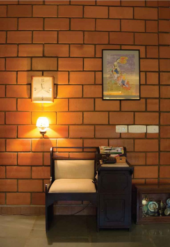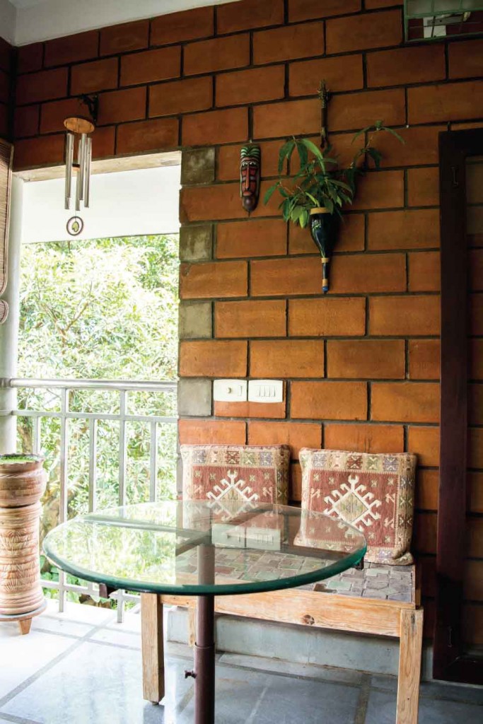 The terracotta colour of the exposed brick interior finish of the walls of the house in combination with the greenish grey hue of the polished kota stone flooring provide a naturally earthy background for the interior of this house. This is interspersed by splashes of unpolished bronze and copper hues, in the form of door handles or vases etc. Most of the eclectic selection of antique furniture is of varying types and colours of wood, in continuation with the earthy theme. Bamboo roller blinds have been used rather than curtains. The unique selection of paintings and sculptures also adds to the charm of the interior. The bathrooms also have antique cabinets that quite unique. A large brass cooking utensil that is typical to Kerala holds a terracotta sculpture and is a feature in the living room. The uniformly earthy theme is translated throughout the house and plays a vital role in creating a homely and cozy atmosphere.